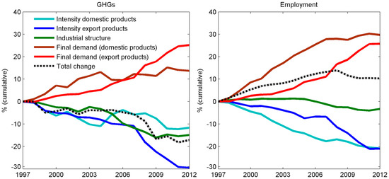 In order to understand better the forces that lie behind these changes, growth in emissions and employment was decomposed by means of SDA. Figure 5 shows the structural decomposition of the changes in both emissions and employment from a production perspective. Regarding GHGs, the emissions intensity (emissions per unit of output) of products destined to be consumed domestically, as well as exports, contributed to drive emissions down, registering a decline of 11% and 30%, respectively. Emissions intensity of export products helped to reduce emissions, particularly during and after the crisis. Emissions embodied in exports fell 8.2% in 2009 with respect to the previous year, while output decreased in 4.9%. From 2009 to 2012, emissions embodied in exports remained almost constant (i.e., 0.3% on average), while output grew by 1.5% per year on average. Technological improvements, reflected in the industrial structure of the economy (i.e., the inter-industry requirements represented by the A matrix), also contributed to push emissions down. However, the effect of final demand offset greater reductions in emissions. The change in emissions, solely due to final demand effects, grew constantly. It is interesting to point out that foreign demand for UK exports exerted a larger pressure than domestic demand. The latter, ceteris paribus, caused an increase of around 25% in emissions, while domestic demand led to an increase of about 14%.