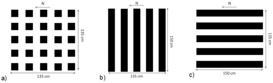 In the blocks structure, the cubes were placed at a distance of 15 cm from each other. The outermost vertexes of the cubes at the corners form a square of 135 cm by 135 cm. In the W-E canyons, the cubes were placed in five rows with a distance between of 15 cm. The cubes disposed in this way formed four canyons in the West-East direction. The value of the H/D ratio that characterizes the canyons was 1. The outermost vertexes defined an area of 135 cm by 150 cm. In the N-S canyons, the cubes were in five rows, with 15 cm distance between each other, and formed four canyons in the North-South direction. The H/D ratio was 1. The occupied area was 150 cm by 135 cm. The facility was exposed to the sun from sunrise to sunset. The three configurations were designed to have the same exposed vertical surface inside the perimeter. To pursue this condition, referring to the schemes depicted in Figure 1, 25 blocks were installed in the urban structure (a) (block shape) and 50 blocks were installed in the urban structures (b,c) (W-E and N-S canyons).