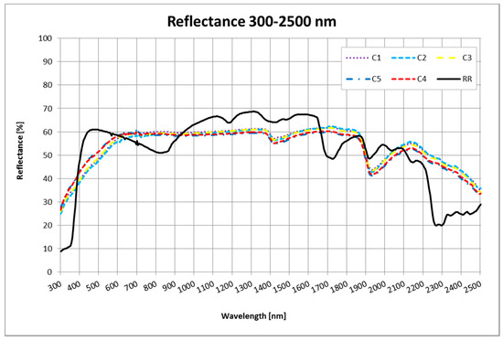 Spectrophotometric analysis was carried out on one RR membrane sample and on five concrete samples (C1–C5), to take into account the effect of surface irregularity. The reflectance spectra of the samples are reported in Figure 4.