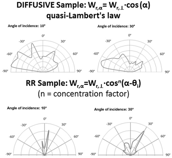 In particular, results show that RR materials reflect the incident radiation mainly back toward the incoming direction for low incidence angles, while they lose this property for high incidence angles [40]. The distribution of reflected radiation by a diffusive material follows the Lambert law: