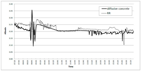 As regards the block scheme in Figure 6, the daily trend shows that the albedo in the presence of RR materials is higher with respect to the diffusive material during most of the day. Some slightly lower values can be found from 10:20 to 12:00 and at 15:45.