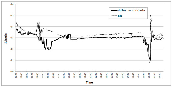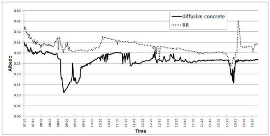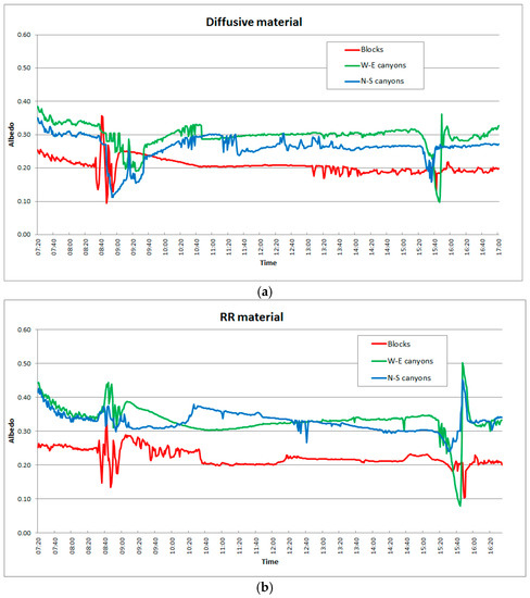 Figure 7 shows the daily albedo results for the W-E canyons scheme. The measured albedo in the RR canyons is clearly higher than in the concrete canyons throughout the whole day. The maximum difference can be found in the morning, before 10:00. Then, in the central hours, a quite constant value of albedo for both the materials can be observed.