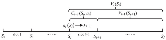 We reformulate the optimization problems in the DP term and show the reformulation process with respect to the problem (P4) for the explanation. Let be the system state at the end of time slot i, which is a vector including indoor temperature , hot water temperature , the SOC of ESS , the SOC of EV and how many time slots the CW, the CD and the DW have been powered, denoted by and , respectively. Let be the decision vector in time slot i, where are continuous variables and are discrete ones. and take values in their feasible sets and , respectively, which are defined by the constraints in (P4). Let be a mapping from the current state to a decision, where is the set of all feasible mappings while in . Let be the cost applying while in and be the total minimum cost for the residual time slots in (Figure 2) and . For convenience, we redefine , and the initial system state is denoted by . The system evolves via transition function , which can be obtained from the models in Section 2. Based on Bellman’s principle of optimality [28], the optimal decisions of (P4) can be obtained by solving the following Bellman equations recursively.