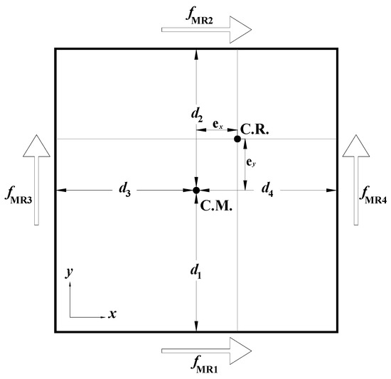 Figure 1 demonstrates the location of the MR dampers schematically. In this figure, C.M. is the center of mass and C.R. is the center of rigidity, and each floor rotates about its center of rigidity. and are the eccentricities in the x and y directions, respectively. Each MR damper is placed with a distance of from the center of mass to create a torsional resisting moment about the vertical axis, which counteracts the torsional displacements imposed due to the eccentricity of the mass.