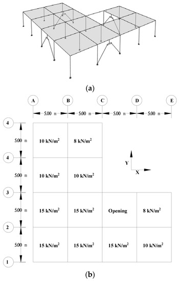 Kaveh et al. [58,59] showed that irregular tall buildings need to be designed with careful considerations, and eccentricities are the main factor for estimating the stress level in external frames for optimal design purposes. In this study, in order to establish the numerical time–history analyses, a ten-story irregular building is modeled based on the studies carried out by the authors of [58,60]. The plan view and the 3D view of the 10-story building model, as well as the loadings, are shown in Figure 4. In order to idealize the model, it is assumed that all the columns have the same stiffness in both directions, and the floors are considered as rigid diagrams. Each story has 3.2 m height and 33,397 kg mass, and the stiffness of each column is 605,391 N/m. The position of each damper does not change in plane, but four cases of MR damper arrangements are considered in this study: