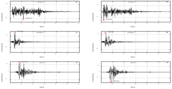 Three of the most commonly used earthquake records in vibration control are selected in this study to evaluate the performance of each control techniques using MR dampers (Table 2). The elastic acceleration response spectra of the selected earthquakes are plotted in Figure 5. In this figure, X, and Y indicate the directions of the applied earthquake loads. In addition, the time–history of the earthquakes are given in Figure 5.