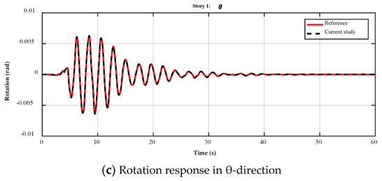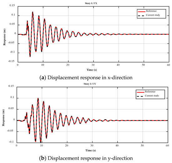 To guarantee the accuracy of the results, and to validate the numerical simulation method, the same example from the study conducted by Nazarimofrad and Zahrai [61] was selected and the responses of the building at the first level for the uncontrolled system are compared with the current study in Figure 6. From the figure, the results are identical, and therefore, the current simulation method is valid and reliable.