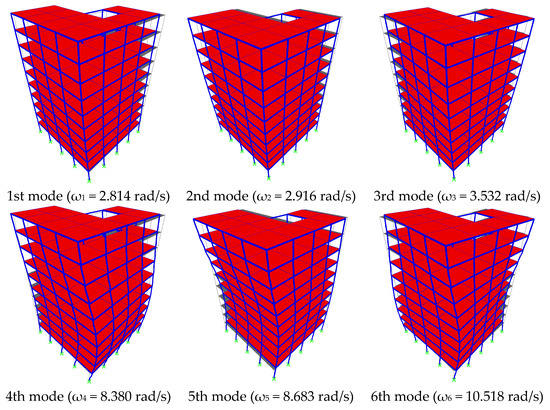 For an irregular building, the higher modes have a significant contribution to the response of the structure under earthquake excitations. The modal analysis of the building is carried out to investigate the primary shape modes. The results of the modal analysis for the bidirectional lateral loads are shown in Figure 7. The initial shape of the building is also shown in gray color. The first six modes of vibration support the idea that the performance of the designed controllers needs to be evaluated under bidirectional earthquake loads. In this study, the number of controllers and the effectiveness of each story on the overall performance of the system is investigated. Since, most of the vibration modes include the couple translational–torsional motion, placing the control devices with the maximum eccentricity can be an advantage for such systems.