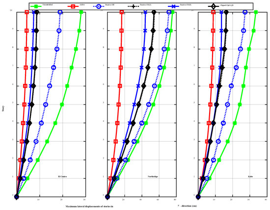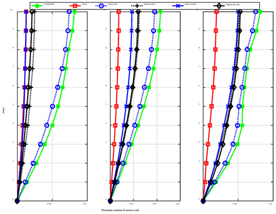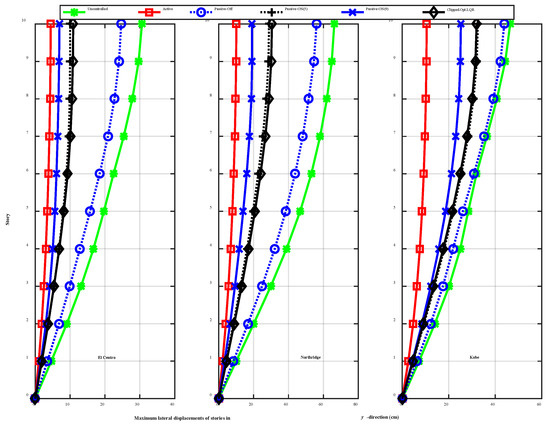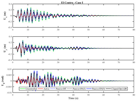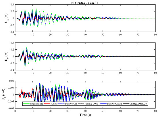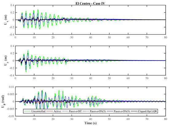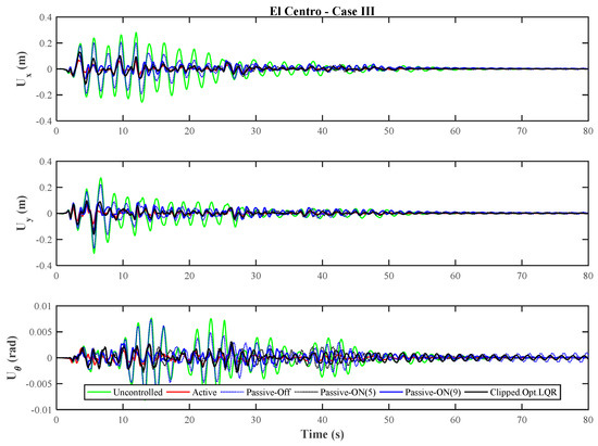 For a better understanding and deep investigation of the performance of each control strategy for reducing the lateral displacements, the lateral displacements and rotation profiles in the x, y, and θ directions for the case IV are shown in Figure 14, Figure 15 and Figure 16. As it is evident from the figures, active control significantly reduces the maximum displacements, however, passive and clipped-optimal techniques are also effective in suppressing the translational-torsional motions of the building. The passive-off control method clearly shows the safety margin compared with the uncontrolled system, and therefore, using MR dampers are always reliable considering the unknown characteristics of the structure and ground motions.