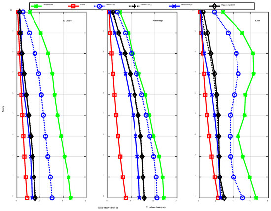 The inter-story drift is an important measure of the shear force of a story level. Reduction in the inter-story displacements, particularly for the lower stories, can decrease the P-Δ effects and nonlinear behavior of the corner columns, which may not be possible to be considered in a simple control algorithm. Figure 12 and Figure 13 show the maximum inter-story drift profiles for the corner columns of the building in two directions. The inter-story drifts are larger in the lower stories, and the upper story columns may remain elastic during an earthquake. Thus, it is critical to control the inter-story drifts for the first stories. As it is obvious from the figures, the most reduction occurs by using the active control and the passive-on method with 9 volts of the input voltage. By comparing the two passive-on controls, it can be said that the inter-story drift for both are very close to each other with respect to the uncontrolled building, and therefore, using a clipped-optimal control may require less energy of control, which is highlighted in the study by Azimi et al. [50]. Furthermore, the passive-off control reduces the inter-story drifts considerably, particularly for the El Centro and Kobe earthquakes, which increases the reliability of the clipped-optimal control in the case of power loss.