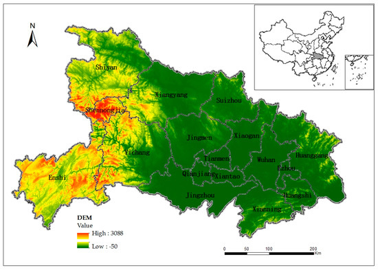 Located in Central China and the middle reaches of the Changjiang (Yangtze) River, Hubei Province covers an area of 185,900 km2 and is within 108°21′–116°07′ E and 29°05′–33°20′ N (Figure 1). The eastern, western and northern areas of Hubei Province are surrounded by mountains, and the Jianghan Plain is located in the central and southern area, which is commonly known as “a land of rice and fish”. The province has a dense hydrological network, and its water resources are abundant. Hubei Province includes 13 prefecture-level cities and 103 counties.