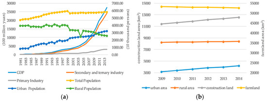 With rapid urbanization, over 1981–2014, the gross domestic product (GDP) in Hubei Province increased from 21.98 to 2737.92 billion yuan. While primary industry increased slowly, the growth trend of secondary and tertiary industries was similar to that of the GDP. From 1981–2014, the total population increased from 47.40 to 58.16 million. Within this change, the urban population continued to increase, while the rural population fluctuated by approximately 39 million during 1981–1999, and subsequently decreased. From 2009 to 2014, the total construction land area increased yearly, with urban construction land growing rapidly and rural areas increasing slowly as cultivated land decreased in area (Figure 2). Overall, the economic, construction land use and population changes are out of sync.