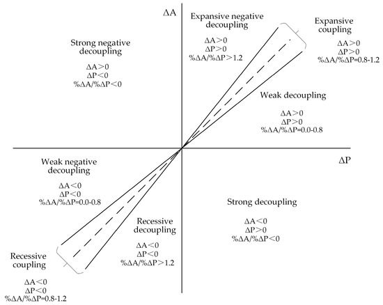 To ascertain the status and degree of decoupling, we used Tapio’s model (2005) [27], which can be expressed in terms of elasticity values, as shown in Equation (1):