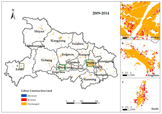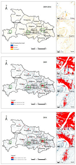 During 2009–2014, urban–rural construction land use in Hubei changed significantly (Table 1). All types of construction land use show a growth trend, and the growth rate of urban construction land is much higher than that of rural construction land. As for the variations within urban construction land, towns increased the fastest, followed by cities, and industry/mining land increased slowly. From 2009 to 2014, the inner structural variation of urban construction land (i.e., city to town to industry/mining land) changed by a proportion of 3.12:2.97:1 to 3.93:4.26:1. Rural settlement land increased slowly, with an average annual growth of 0.37%. Figure 4 shows the landscape pattern change of urban–rural construction land during the study period. As shown in Table 1 and Figure 4, the distribution of urban construction land is concentrated, while that of rural settlement land is scattered. The absolute quantity of construction land change was relatively small, and the variation ratio was obvious.