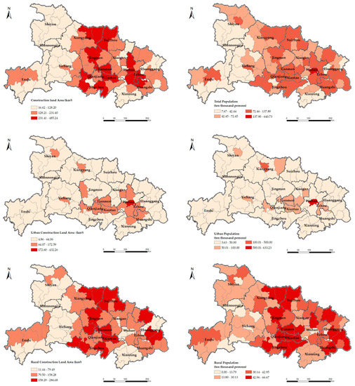 Spatial distribution of the construction land area and population in Hubei in 2014.