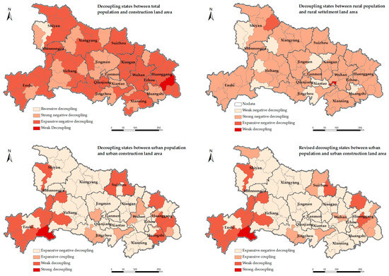 The relationship between the total population and construction land could be divided into four types: recessive decoupling (1 of all 85 counties), strong negative decoupling (21 of all 85 counties), expansive negative decoupling (62 of all 85 counties) and weak decoupling (1 of all 85 counties) (Figure 6). The total population of most counties (63 of all 85 counties) showed a growth trend, while the construction land area decreased in only one county. In 63 counties, both the population and construction land increased. Sixty-two counties showed expansion negative decoupling, that is, the growth rate of total population was less than the growth rate of the construction land. A county in Huanggang exhibited a weak decoupling state, in which the growth rate of total population was faster than the growth rate of the construction land. The 21 counties with strong negative decoupling were mainly distributed in Huangshi, Tianmen, Xiantao, Jingmen and Yichang, in which the total population decreased as construction land increased. A county in Shiyan was in a state of recessive decoupling, in which the rate of reduction of the total population was less than the rate of reduction of construction land.