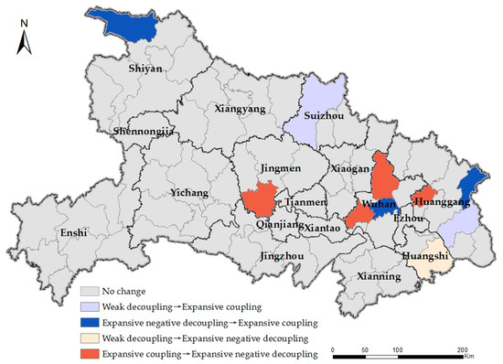 The revised relationship between the urban population and urban construction land could be divided into four types: expansive negative decoupling (61 of all 85 counties), expansive coupling (11 of all 85 counties), weak decoupling (12 of all 85 counties) and strong decoupling (1 of all 85 counties). Ten counties changed types (Figure 7). Both Suizhou and Huanggang had a county that converted from weak decoupling to expansive coupling. The per capita urban construction land of the two counties in 2009 was 173.03 m2 and 137.78 m2, respectively, which exceeded the national standard. During 2009–2014, the growth rate of the urban population was higher than the growth rate of urban construction land, which made the per capita urban construction land appear to be reasonable. Wuhan, Shiyan and Huanggang each had a county that shifted from expansive negative decoupling to expansive coupling. The per capita urban construction land of the three counties in 2009 was 62.86 m2, 65.31 m2 and 88.10 m2, respectively, which was lower than the national standard. During these five years, the growth rate of the urban population was lower than the growth rate of urban construction land, which made the per capita urban construction land appear to be reasonable. A county in Huangshi converted from weak decoupling to expansive negative decoupling. The per capita urban construction land of this county was 212.05 m2 in 2009, which was higher than the national standard. However, the urban construction land continued to grow during the five years. Controlling the urban expansion in this county is urgent. Two counties in Wuhan and one in Jingzhou and Huanggang, respectively, shifted from expansive decoupling to expansive negative coupling. Although the growth rate of the urban population and urban construction land was more appropriate, the lowest per capita urban construction land of these counties was 186.12 m2 in 2009, which was in considerable excess of the national standard. If allowed to continue, a surplus of urban construction land would continue to exist and would ultimately cause extensive and low-efficiency use of urban construction land. It is important that the urban expansion in this county be controlled.