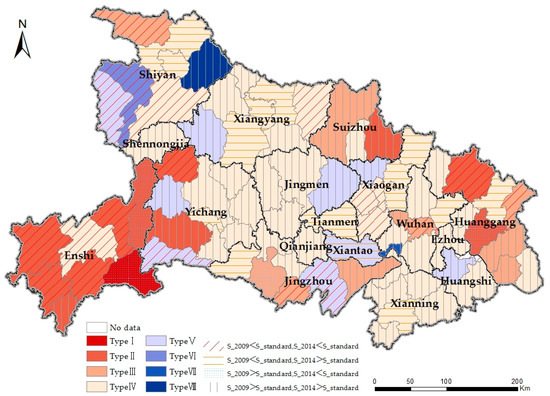 To analyze the relationship between the urban–rural population and construction land, we combined the coupling types of population and land change in urban and rural areas. They were divided into eight types (Table 3 and Figure 8). The main types were Type II to Type V; only one county each belonged to Type I, Type VI, Type VII, and Type VIII. As the per capita rural settlement land in 2009 and 2014 were both higher than the national standard, we distinguished the subtypes based on a comparison of the per capita urban construction land with the national standards. The result indicated that there were 8 types and 16 subtypes, and corresponding suggestions for each were then put forward.
