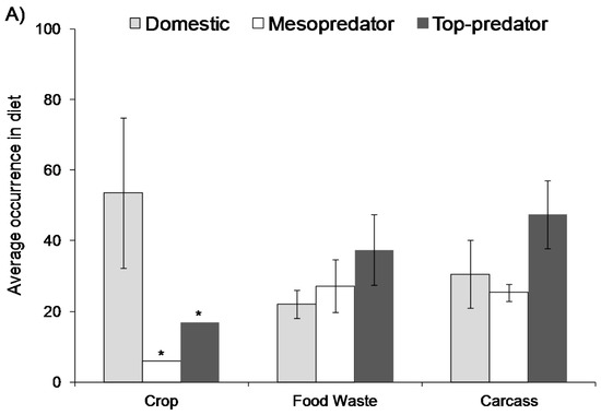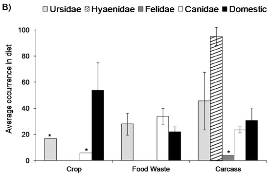 Average occurrence of food waste in the diet of (A) terrestrial predators > 1 kg in body size split into three functional groups and (B) the same data split into five family groups. The figure is based on data from 83 published studies (±95% confidence intervals) [5]. Frequency of occurrence of prey items in scats was used wherever possible. The asterisk (*) indicates that only one study was available. In (A) domestic species are those that have been purposefully changed by genetic selection by humans (e.g., domestic dogs). Mesopredators are species that suffer from top-down effects (e.g., coyote), whereas top predators are species that suffer little from top-down effects upon reaching maturity (e.g., grey wolf).