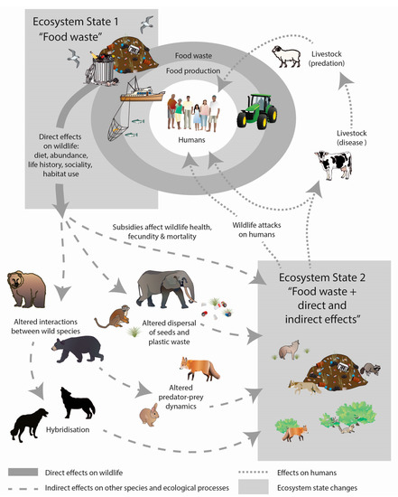 Conceptual model showing how wildlife access to food waste can alter wildlife ecology and behaviour, other species, and ecological processes, as well as exacerbate human-wildlife conflicts. The model includes two ecosystem states. In Ecosystem State 1, wildlife use of food waste directly affects wildlife ecology and behaviour (e.g., changes in diet, abundance, life history, sociality, and habitat use). Over multiple generations, these direct impacts are likely to indirectly affect other species and ecological processes, resulting in the formation of Ecosystem State 2. In both ecosystem states there will be impacts on humans and human livelihoods, especially via disease transmission, predation on livestock, and attacks on humans by wildlife.