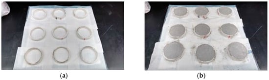 Figure 1. (a) Plastic molds of proper size. (b) Concrete mix was poured into molds to create the concrete samples.