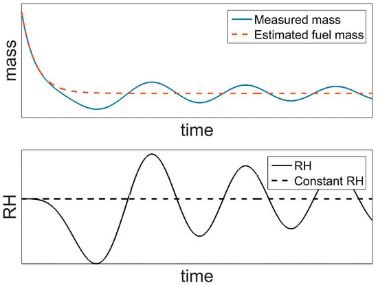 Humidity is a significant parameter when it comes to assessing the long-term behavior of the liquid fuel that is present in and on a concrete sample. This is because the mass of the concrete sample does not only change due to fuel evaporation but also due to absorption and desorption of water that occur because of a changing RH. We observed a clear relationship between RH(t) and the measured mass m(t) after a certain period of time (usually after the fuel mass levels off). The measured mass m(t) is the sum of the mass of the fuel, which is present either as a sessile droplet on the surface or infiltrated into the concrete according to Equation (1), and the mass of absorbed water: