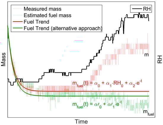 Figure 4 illustrates how fuel mass would monotonically decrease if RH changes did not occur, behavior expected due to the continuously ongoing fuel evaporation. In order to evaluate the model fit and accuracy of the trend lines, we calculated the coefficient of determination, R2.