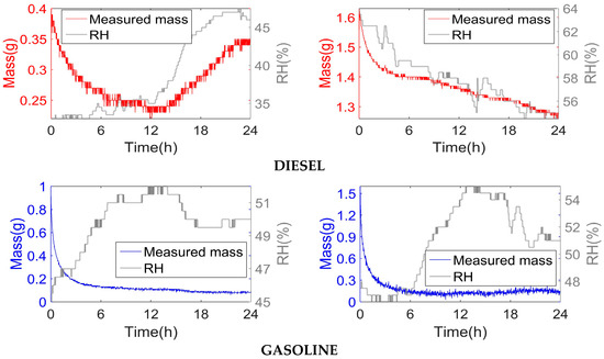 Atmospheric conditions: Humidity affects the amount of water sorbed onto and into the concrete. Therefore, variations in the collected mass data occurred that cannot be solely attributed to fuel evaporation. In order to assess the influence of the changes in humidity over the readings, we measured relative humidity (RH) and temperature using a USB humidity logger (Lascar EL USB 2 LCD+). The sensor was placed between the two balances. This device has an accuracy of ±2% for RH and ±0.3 °C for temperature under the conditions in which we were working. At the end of each experiment, we exported the data to the electronic spreadsheet, in which the mass data were stored. The temperature in the fume hood was quite stable, about 19–20 °C during the diesel experiments, and about 24–25 °C during the gasoline experiments. However, relative humidity could vary within a wide range, between 35% and 70%. The variations occurred during the course of a day and were likely affected by air-conditioning and changing weather.