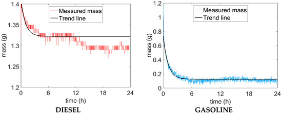 Linear regressions considering RH were performed to obtain trend lines, which represent an accurate description of the fuel evolution. For gasoline experiments, the regression models always give a very good description (R2 ~0.98). In the case of diesel, some regressions are better than others (average R2 about 0.90), but in general, estimations are quite good. In Figure 6, two trend lines are shown that predict the evolution of fuel mass if relative humidity had been held constant during the spillage experiments.