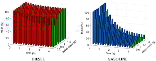 For each type of fuel, gasoline and diesel, eight 24-h experiments with different initial masses were carried out.