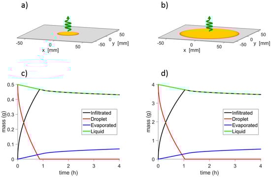We performed supporting pore-scale modeling based on previously developed models [13,21] in order to explore why the initial droplet mass does not significantly affect the fraction of infiltrated and evaporated fuel. This mathematical model describes the dynamics of a spilled fuel droplet, which infiltrates into porous medium and evaporates into a turbulent atmosphere. The porous medium is described as a bundle of vertical capillary tubes, and the model assumes a sharp wetting front during infiltration. Hilpert and Breysse [13] have already used this model to show that the initial droplet mass does not affect these fractions very much for gasoline. They attributed this to the fact that the thickness of a sessile gasoline droplet does not change much when the droplet mass is changed from 0.9 to 4.5 g. We now performed similar simulations for diesel. For the diesel fuel, we assumed a density ρ = 0.83 g/cm3 [22,23], a dynamic viscosity η = 3 × 10−3 kg m−1 s−1 [22,24], an interfacial tension σ = 28 mN/m [23,25], and a vapor pressure e = 0.5 mmHg [26,27]. We also assumed an evaporation rate Epo = 1 mm/day. The contact angle was θ = 20°, and the permeability κ = 1.4 × 10−2 m2, and porosity ε = 0.15 of concrete were the same as used in Hilpert and Breysse [13]. Figure 8a,b shows the initial shapes of two modeled sessile diesel droplets with quite distinct masses of 0.5 and 4.0 g. Due to gravitational forces, the air-liquid interface does not have the shape of a spherical cap but looks rather like a pancake. The two sessile droplets have quite similar thicknesses. As a result, the modeled fractions of infiltrated and evaporated diesel (see Figure 8c,d) do also not differ very much. This is entirely consistent with the diesel experiments of this paper.