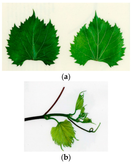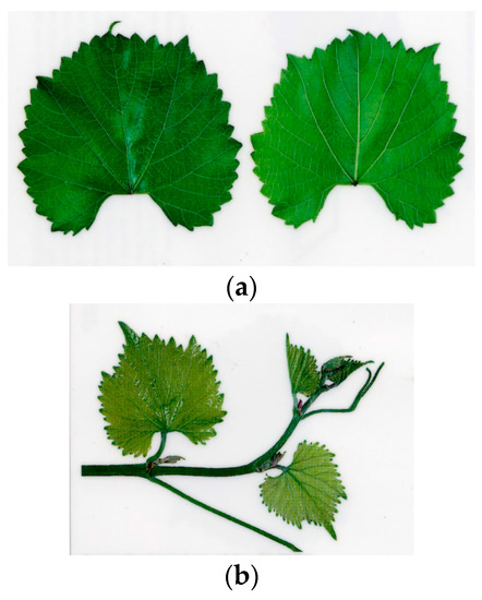 1616 C P American grapevine rootstock [11]. (a) 1616 c grapevine leaves. (b) 1616 c grapevine shoot.