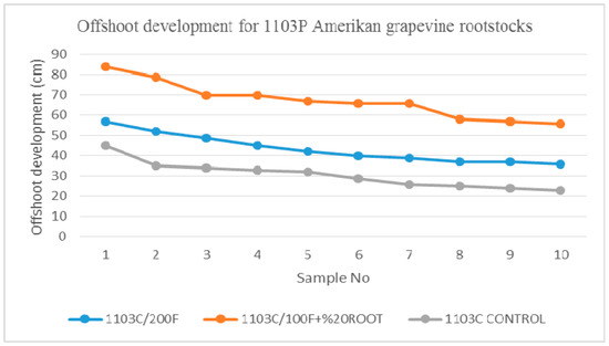 When 20% root and 100 g/100 L water foliar fertilizer was applied to the same rootstocks (second application), it was observed that the average height of the offshoots is 56.3 cm. After the fertilization was applied to 1103 P American grapevine rootstock, it was observed that the offshoots grew between 57 cm and 27 cm and average growth was 39.5 cm. Eighty percent of 1103 P C American grapevine rootstocks showed a growth of over 35 cm.