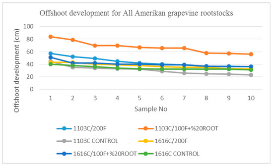 Offshoot development belonging to all American grapevine rootstocks (Graphics were made by adding the growth amounts to the average height before the application, based on 10 rootstocks which grew the most).
