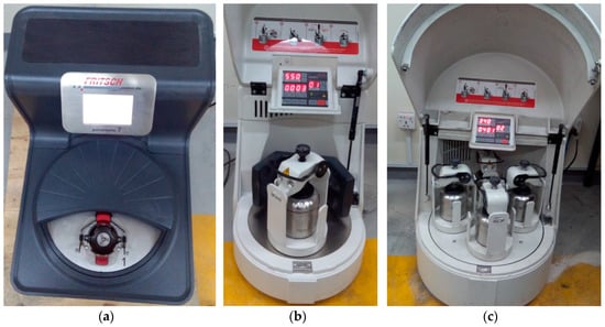 Mills used in this study to grind electric arc furnace slag aggregates of size 5–10 mm: (a) planetary micro mill PULVERISETTE 7; (b) planetary mono mill PULVERISETTE 6; and (c) planetary mill PULVERISETTE 5/4.