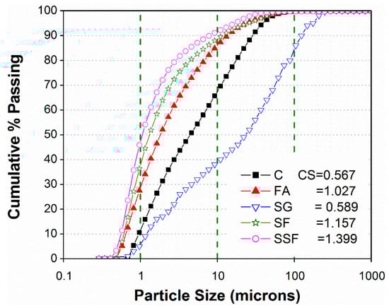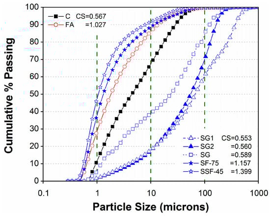 Particle size curves of cement and its substitute materials used in this study (FA, SG, SF, and SSF).