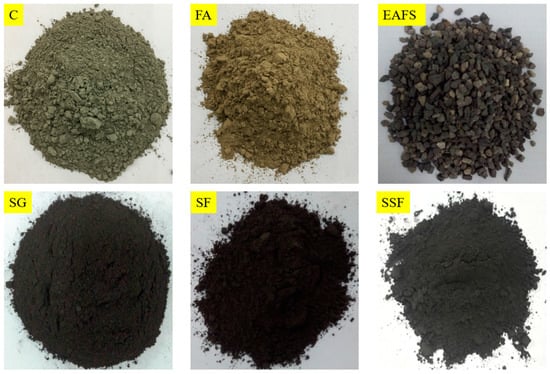 Cement (C) and its substitute materials fly ash (FA) and electric arc furnace slag (EAFS) in aggregate form before grinding, slag after grinding (SG), SG passing sieve #200 (SF), and SG passing sieve #325 (SSF).
