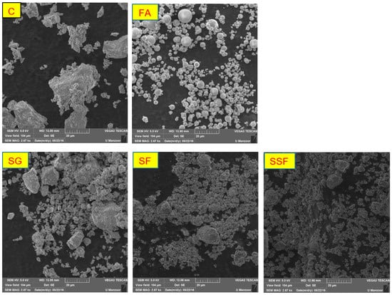 Scanning electron microscopy (SEM) images of cement (C) and its substitute materials fly ash (FA) and electric arc furnace slag (SG, SF, and SSF).