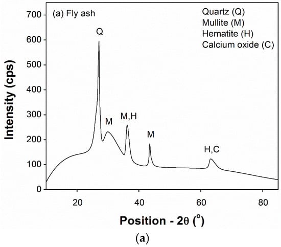The XRD pattern of fly ash was shown in Figure 7a. From XRD results, it was seen that the quartz and mullite are the two dominant phases present in FA sample. Due to its fine size and very high surface energy, quartz crystal demonstrate high pozzolanic reactivity in mortar matrix. However, mullite phase will remain chemically inert in mortar []. Additionally, two more phases namely hematite and calcium oxide were also found in XRD pattern of fly ash.