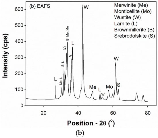 The EAFS used in current study mainly consist of CaO, SiO2, Al2O3, MgO and some other metal oxides. The total concentration of these major oxides is 92.04%. Therefore, the EAFS can be characterized by CaO–MgO–SiO2–FeO quaternary system. On the other hand, the fly ash (FA) is mainly composed of SiO2, Al2O3 and Fe2O3. The sum of the major components SiO2, Al2O3 and Fe2O3 in EAFS is 51.6% which does not meet the minimum limit of 70% as set by ASTM C618 [], while FA is rich in these oxides (84.7%) and fulfill the criteria required by a material to be pozzolanic. The amount of sulfate ion (SO3) in EAFS is around 0.1%, which is quite far from the upper limit of 4%, and thus clearly meets the standard requirements. The loss of ignition in EAFS is almost negligible.