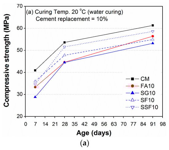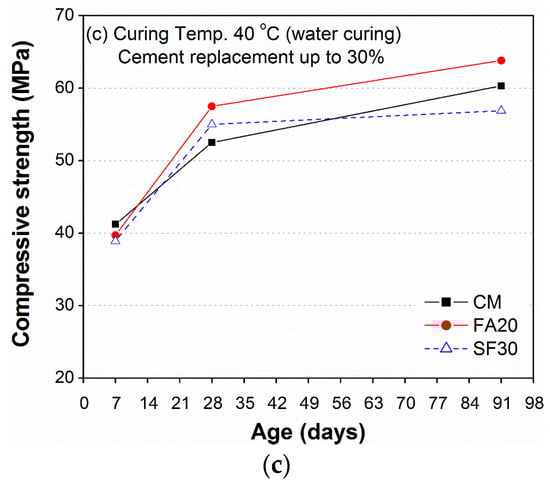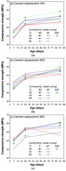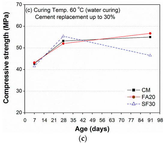 Based on the previous results of 10% and 20% cement substitution, authors also investigated the influence of 30% substitution for high fineness slag (SF and SSF) and a direct comparison was made with results of CM (Figure 11c). Comparison of results indicated that higher cement substitution with EAFS (30%) led to significant strength loss at all ages under normal curing conditions (water cured at 20 °C). However, this loss was minimized by increasing fineness from SF to SSF at all ages, especially at 91 days, as it reached close to that of CM (58 MPa as compared to 61.3 MPa of CM). Despite of negative impacts of high substitutions, a significant improvement in rate of strength gain was observed under moderately high (40 °C) and high curing temperatures (60 °C) particularly at 7 and 28 days. This is due to accelerated hydration reaction under high curing temperatures at early-ages because of increased surface area of EAFS. The results indicating that the pozzolanic reaction of slag was favored by the higher temperatures at early ages. Similar results were reported by others as they found maximum consumption of CH content in slag cements at early days and little or no change in CH content after seven days []. The strength dropped significantly at 91 days with increasing curing temperature because of cross-over effect of temperature and the maximum loss occurred corresponding to curing at 60 °C. As mentioned earlier, the continuous higher curing temperatures result in a coarser pore structure, thus reduce the long-term strength of concrete [].