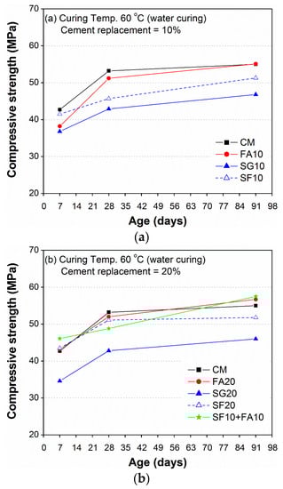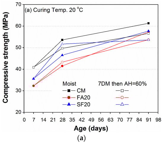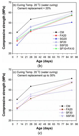 The compressive strength of CM was significantly reduced under PMC as compared to CMC at both 28 and 91 days (Figure 12a). However, this trend was different in mortars containing FA20 and SF20 than CM as they demonstrated slightly increased 28 days strength under PMC as compared to CMC and vice versa at 91 days. The decrease of later age strength under PMC (low humidity) was also confirmed by other research [,]. Moreover, it seems that the microstructure of cement was more influenced by relative humidity as compared to mortars containing FA and SF []. The higher 7 and 28 days strength of SF20 as compared to FA20 could be because of its high surface area which increased the rate of hydration reaction between slag and cement clinker.