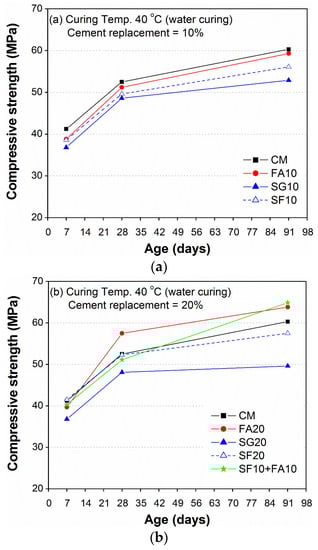 Under standard moisture and temperature curing conditions, the strength of mortar containing FA or EAFS was lower than CM especially at early-ages. As mentioned earlier in preceding section, despite of lowered strengths, there are several other benefits of using these materials in construction under different circumstances. In view of established fact that the reactivity of cementitious and pozzolanic materials enhanced under high curing temperatures [,,,], authors investigated the influence of different high curing temperatures (40 and 60 °C) on mortar containing FA and EAFS (SG and SF) and compared their results with those of standard curing. Such high curing temperatures were chosen considering the hot summer season in most parts of eastern Saudi Arabia where temperature rises to more than 50 °C.