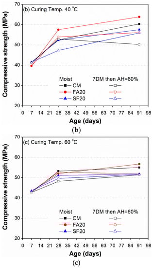 Unlike standard temperature curing (20 °C), the compressive strength of mortars (CM, SF20, and FA20) subjected to moderately high curing temperature (40 °C) reduced significantly under PMC as compared to CMC at both 28 and 91 days (Figure 12b). Very similar results were observed by other research in the past [,]. The trend of reducing strength was similar in all mortars and this reduction increased further with aging. No strength loss was observed in CM at 28 days, which however demonstrated maximum reduction at 91 days followed by FA20 and SF20. From results, it seems that the microstructure of mortar matrix can be influenced more under high environmental temperatures as compared to relative humidity []. Under high relative temperature, this can be related to formation of shrinkage microcracks caused by drying in a low relative humidity environment [,]. Interestingly, 91 days strengths of SF20 and FA20 under PMC were identical and at the same time higher than CM. As mentioned earlier, this might be due to their more refined pore structure than CM containing only cement [,]. Similar to moderately high curing temperature, the maximum strength reduction under PMC at high curing temperature (60 °C) was also observed in CM at both 28 and 91 days (Figure 12c). However, the strength loss was negligible in SF20 mortar and identical 91 days strengths were observed for all mortars (CM, SF20, and FA20) when subjected to PMC.