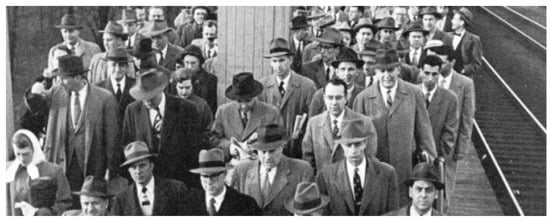 In the mid-20th century, as capitalist societies entered into the era of consumer capitalism, where growth in capital was dependent on consumption rather than production, the productivity of the resources which could be converted into money gave way to the symbolism of objects in association with monetary value, and this stimulated consumption [17]. As a result, factory workers’ age were transformed into that of middle-class white-collar workers, creating a bureaucratic society represented by ties and gray suits, as shown in Figure 3. According to William H. Whyte, it was also an age of “organization” [18], or class identity, symbolized by the sign-value that could be converted into monetary value, and office workers were trying to be part of the anonymous middle-class community at the expense of their individuality.