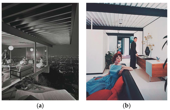 In particular, the 22nd house of the case study house series, Stahl House, was built on a cliff overlooking downtown Los Angeles and was open to the public, attracting a great deal of attention. In the process, Julius Shulman, one of the best architectural photographers of the day, played a major role. He created a picture of two beautiful women sitting in the living room of Stahl House conversing against the backdrop of Los Angeles at night (Figure 4a), and this image came to represent the ideal home in the consumer society of the mid-20th century [20].
