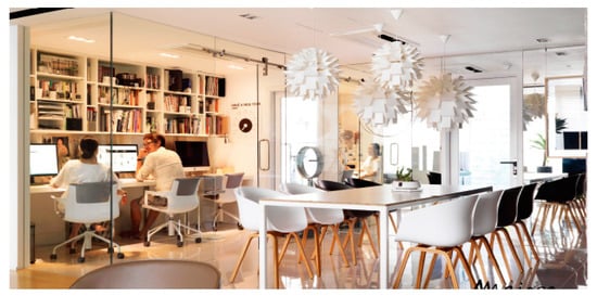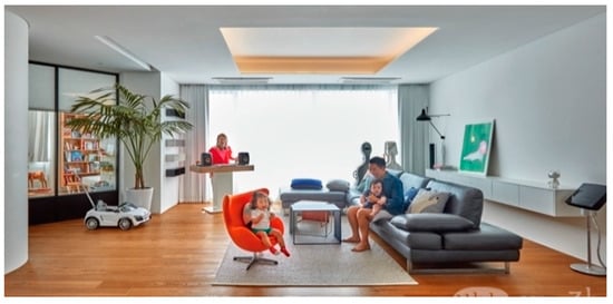 As seen in the cases above, a home is no longer a mere resting place, not the opposite of a workplace. One of the conditions in which a home is transformed into a production space is related to the fact that “one laptop is all that is needed for visual work” [54]. In this way, most creative jobs are characterized by the ability to work from anywhere with simple tools like computers and smart devices. The same applies to the following case of a couple who operate an online shopping mall. “The unique thing is that the space, where the original room had been, was closed with glass creating a new home office space. This office space with glass finish, which would be applied in a general office, makes the home look extraordinary. Originally, it was for their son, a junior high school student, making a transparent room where he would use the computer. Letting the computer out of his room, they led him to this office space. As times go on, they made their work place next to his, and then this space naturally became the work space of the whole family” (Figure 7) [55]. In another example “she set a table with a length of 3 m in the largest room. This table can be used for various purposes such as a dining table for guests, a drawing table for painting, and a reading or working desk with her husband” [56], showing that a multipurpose table large and long enough to satisfy various conditions is also important for working in residential spaces.