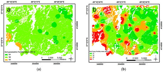 Figure 2. Spatial variability and suitability classes of soil in the study area based on: (a) Soil parametric fertilityindex (SFI-1); (b) Soil fuzzy fertility index (SFI-2).