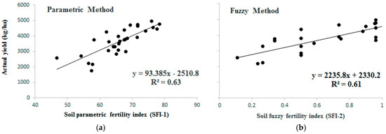 The index values (SFI-1 and SFI-2) calculated by the two different methods were compared through the Pearson correlation coefficient. There was a relatively high and significant correlation between the two index values (r = 0.68, p < 0.05), which indicated a significant positive relationship between the two indexes. Hence, the two approaches are related in the assessment of the soil fertility for crop production. Since both two methods were significantly correlated to each other, it is difficult to conclude which is the best approach; however, it depends greatly on factors such as the design of the study and choice of soil properties included in the model to compute the soil fertility index. The advantage of using the parametric method is that the soil fertility index could be assessed after measuring any number (low to high) of soil parameters, and this procedure is easier compared to the fuzzy method in terms of the scoring. It requires more literature review and expert opinions, however. The disadvantage of the method is that it requires multiple numbers of soil properties under different soil functional systems, which may be expensive and time-consuming in practical cases. The advantage of the conducted fuzzy method is that it includes scoring based on the design of the study, the system or the dataset to offset the subjectivity of the approach present in SFI-2. Additionally, it is advantageous due to its ability to calculate soil fertility with a lower number of soil parameters. However, some key soil indicators such as soil fertility (macro and micronutrients) and microbial (microbial biomass, microbial C, and N, and soil respiration) parameters for effective prediction of crop yield were not included in the dataset of the model of the fuzzy method, which was conducted by Dobermann and Oberthür [2]. The disadvantage of the fuzzy method is that it is subjective and relies mainly on the researcher’s point of view. In fact, soil parameters and the b and d values should be selected carefully.
