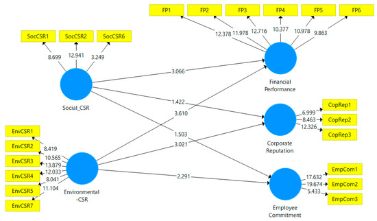 The highest coefficient value from the original sample is 0.303 for Environmental-CSR → Financial Performance, followed by Environmental-CSR → Corporate Reputation (0.269), while Social-CSR → Social-CSR → corporate reputation and Employee Commitment have the least values of 0.149 and 0.172, respectively.